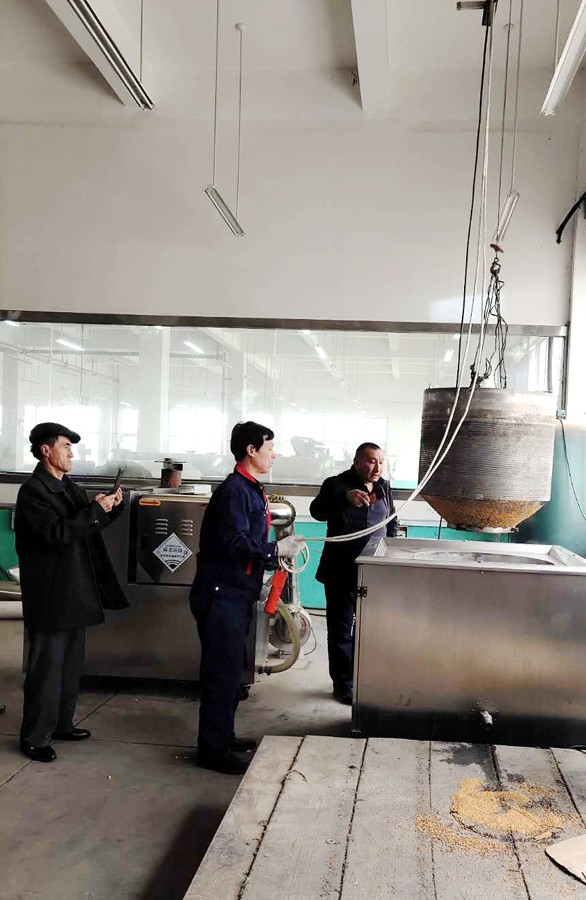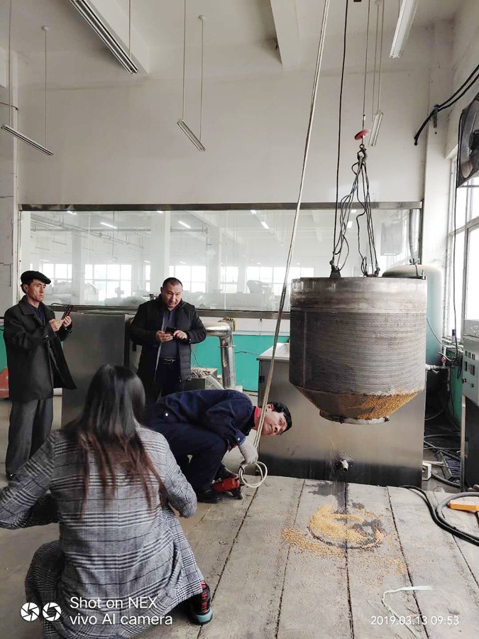 3月13日,新疆客户带原料糜子来许昌智工考察试机电磁炒货设备!期待合作共赢!
