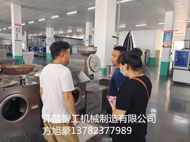 现场试机许昌智工7-10型电磁炒货机进行炒制,一锅30斤,使用麦麸做介质,20分钟一锅,客户对试机效果非常满意,现场下单订购电磁炒货机一台。