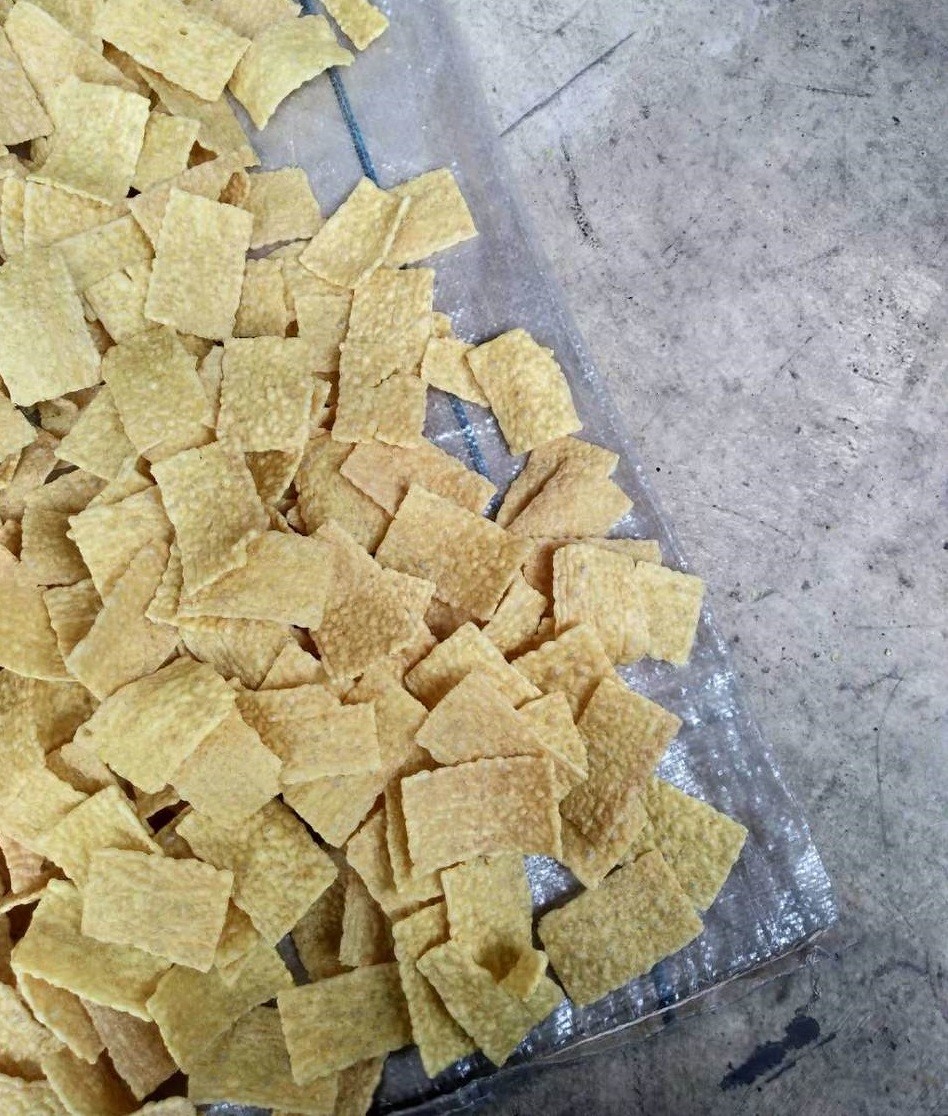 湖北陈总寄来两包苦荞加工膨化食品,用DCCL6-20两米流水线炒货机做测试,效果达到满意! 下图是经过烘干的苦荞片原材料,先把苦荞籽磨成面,再加工成片状
